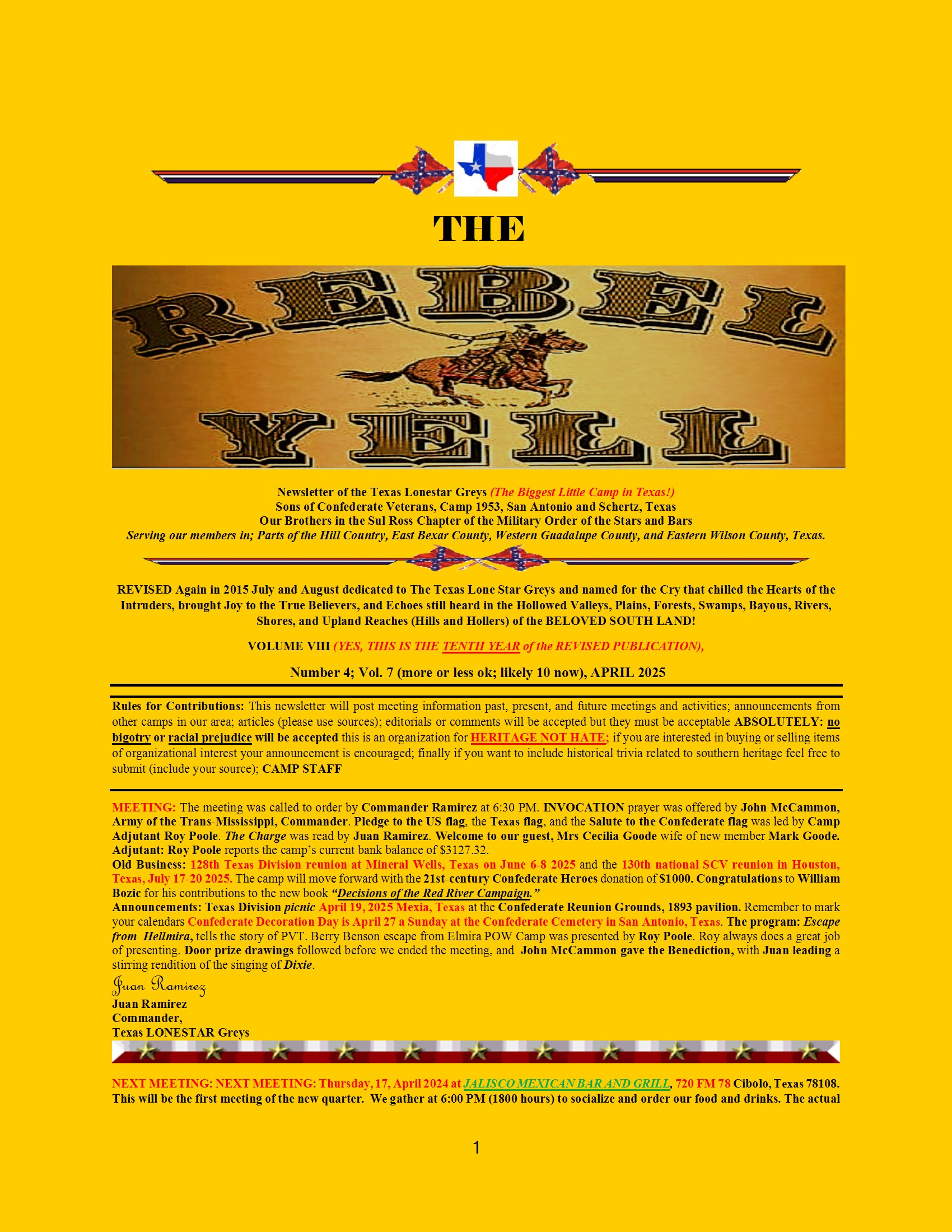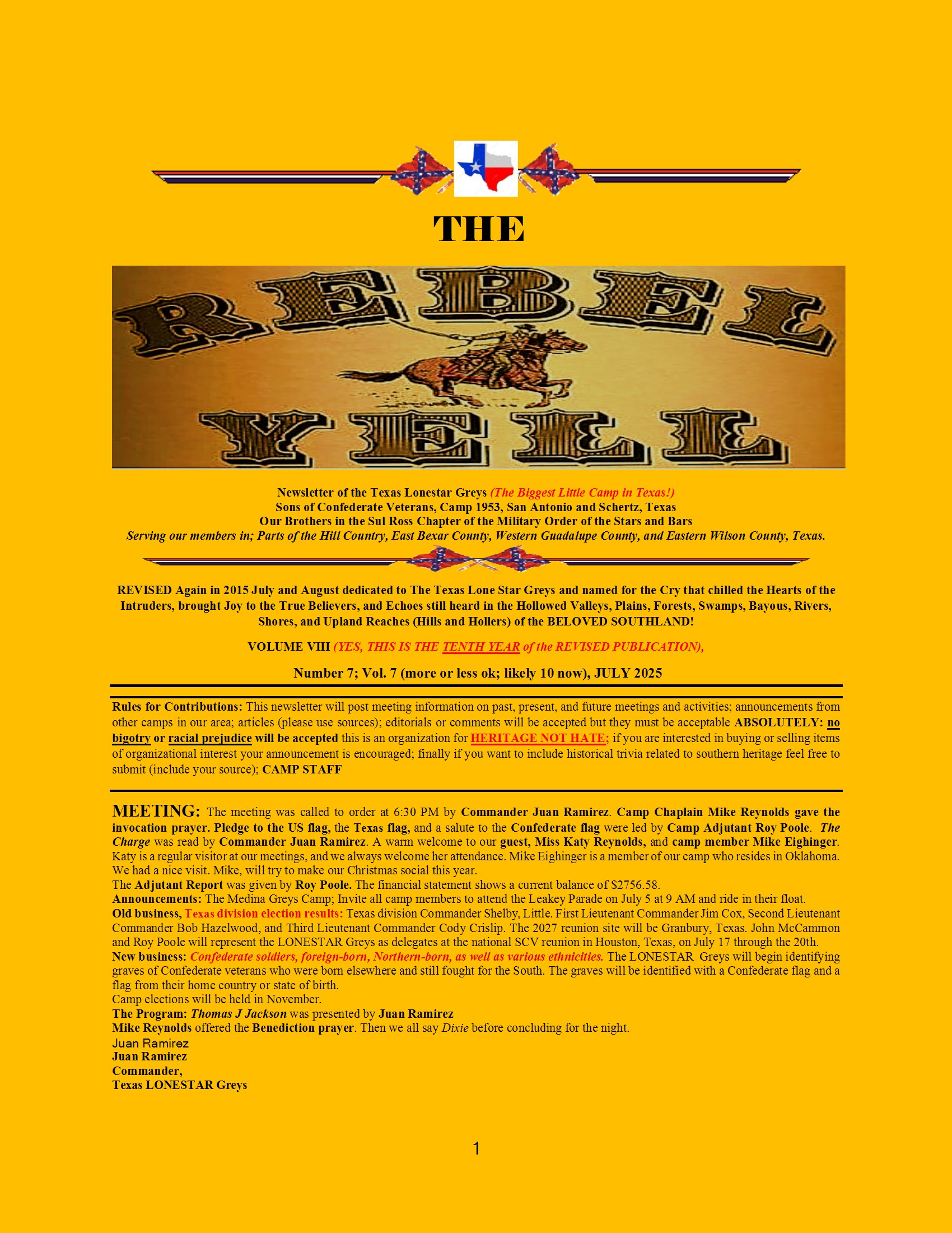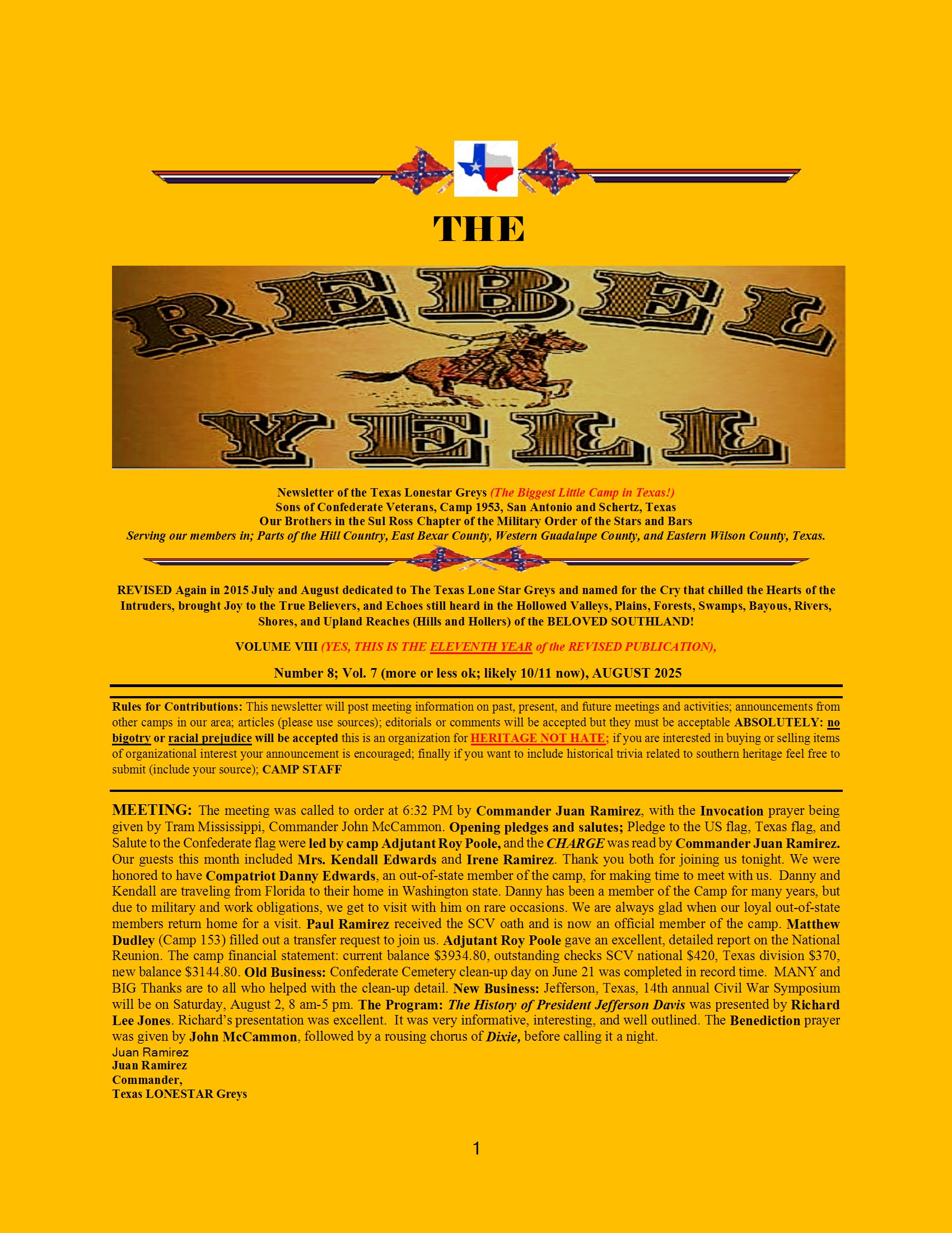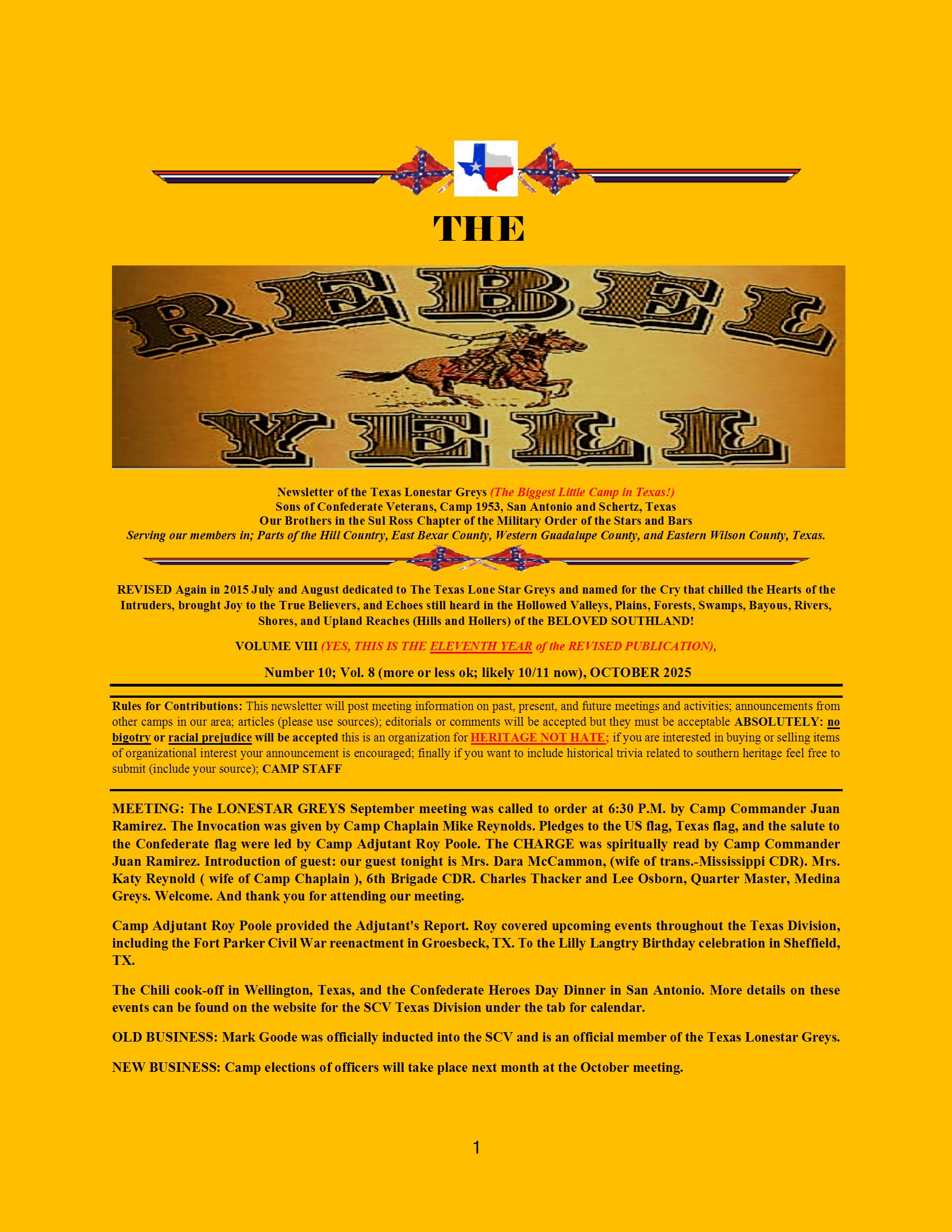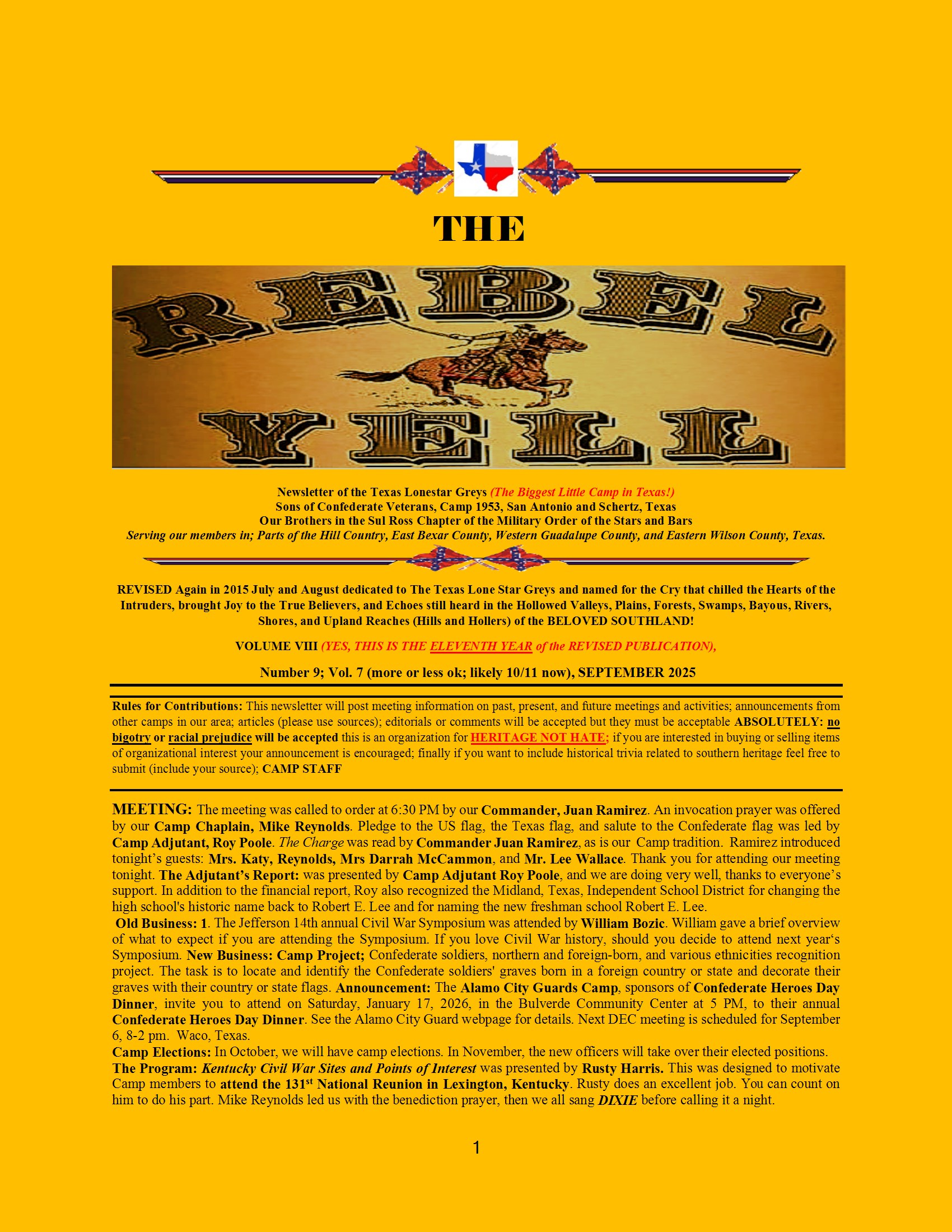 The Rebel Yell is our camps newsletter. Once a month we publish a newsletter that provides announcements, stories, and more. Below is our archive of newsletters.